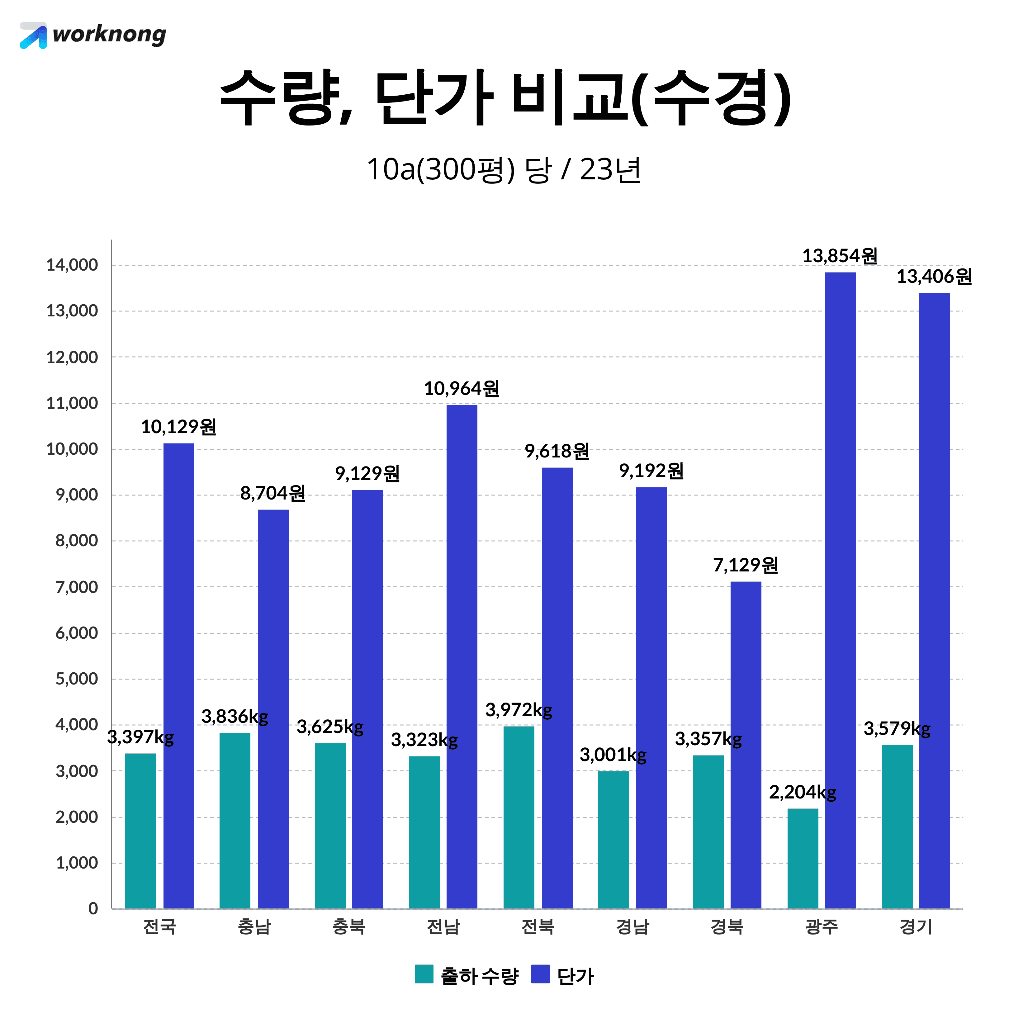 지역별 출하 수량과 단가가 어떻게 달라지는지 한눈에 알 수 있습니다.