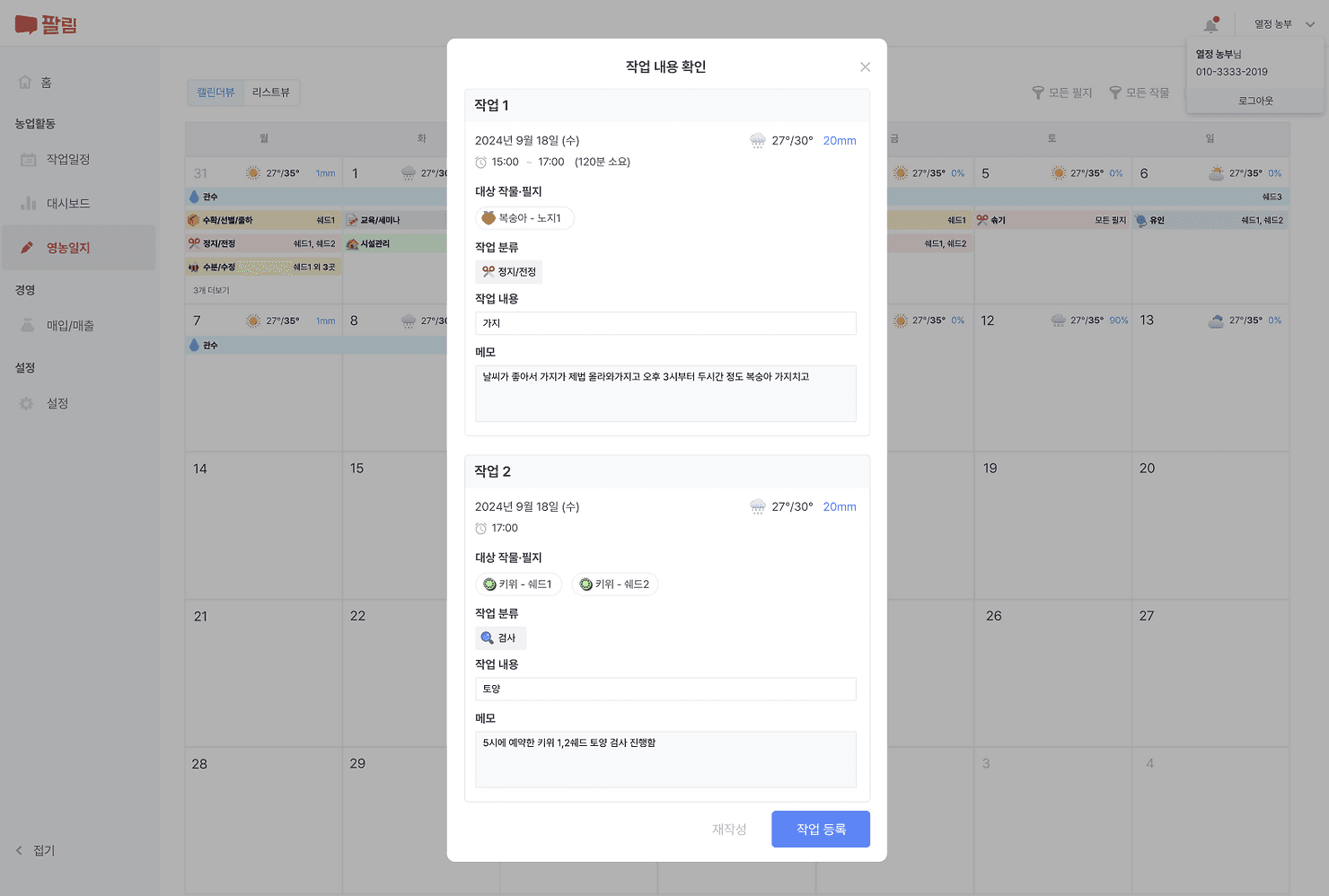 원래같으면 대상 작물, 필지, 작업 분류를 일일이 선택하고 영농일지를 써야하는데, 팔림 영농일지를 사용하면 짧은 텍스트 몇 줄로 영농일지를 빠르게 작성할 수 있습니다. 또 날씨, 강수량 등의 정보를 자동으로 입력해주어 기존 프로그램들보다 훨씬 편리합니다.