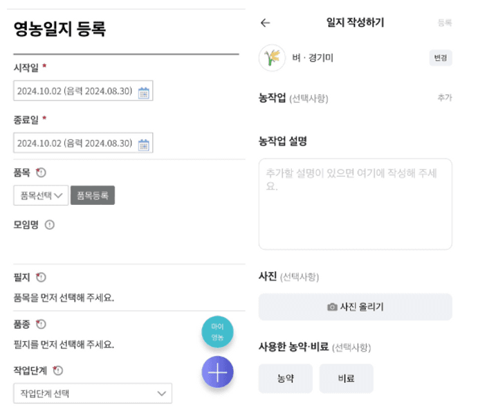 1. 농업온의 경우는 품목, 품종, 활동유형, 날씨 정보 등 너무 많은 항목을 작성하도록 되어있어요.