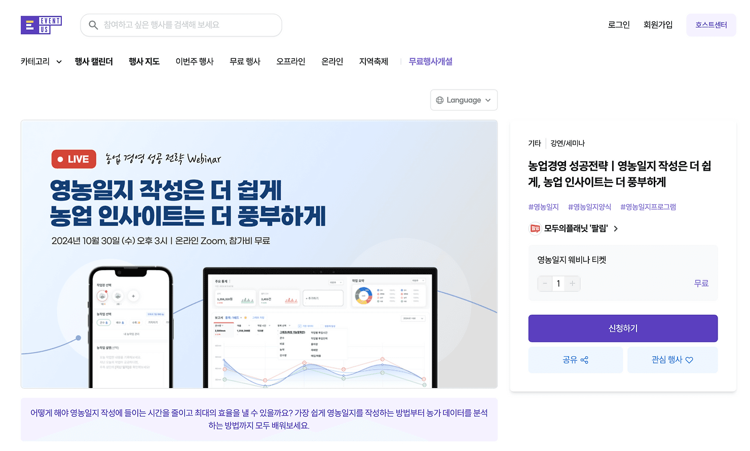 농업경영 웨비나ㅣ영농일지 작성은 더 쉽게, 농업 인사이트는 더 풍부하게
