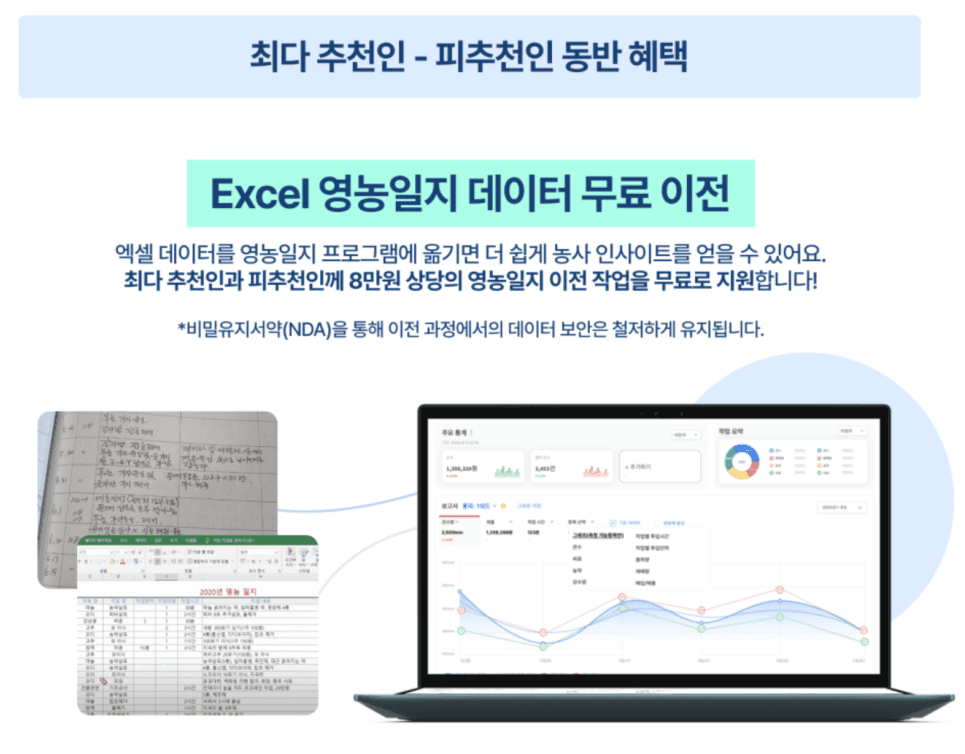 게다가 초대한 분과 초대받은 분 모두에게 8만원 상당의 '영농일지 데이터 이전 작업'을 지원해드립니다. 엑셀에 있던 데이터를 더 자세하게 시각화할 수 있는 기회입니다. 자세한 지인 초대 이벤트 참여 방법은 아래 페이지에서 확인해주세요👇