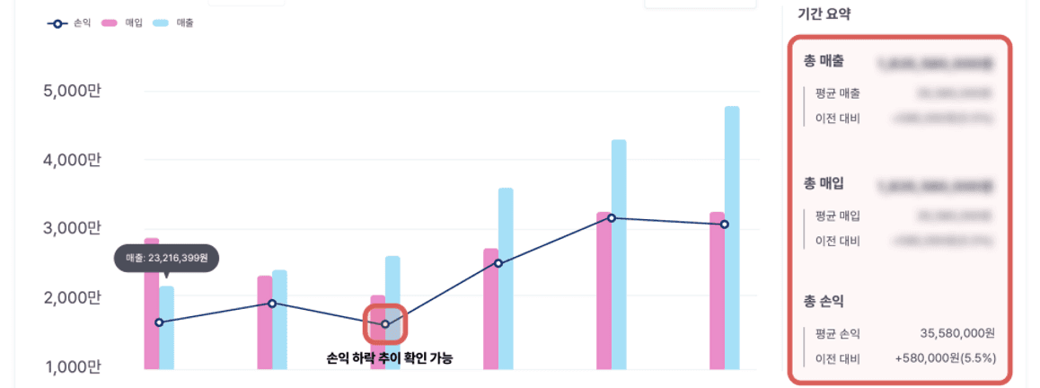 앞서 말씀드린 것처럼 손익이 급격하게 떨어진 연도가 있다면, 그 때 어떻게 비용을 썼는지 등이 궁금해질텐데요. 이를 위해 '날짜별 상세 매출 및 비용 리스트뷰'를 제공합니다. 이 기능을 통해 어떤 항목에서 비용이 많이 나갔는지 파악할 수 있습니다. 상세한 비용 데이터들을 확인하여, 비용을 절감하고 향후 순이익을 더 늘릴 수 있겠죠.