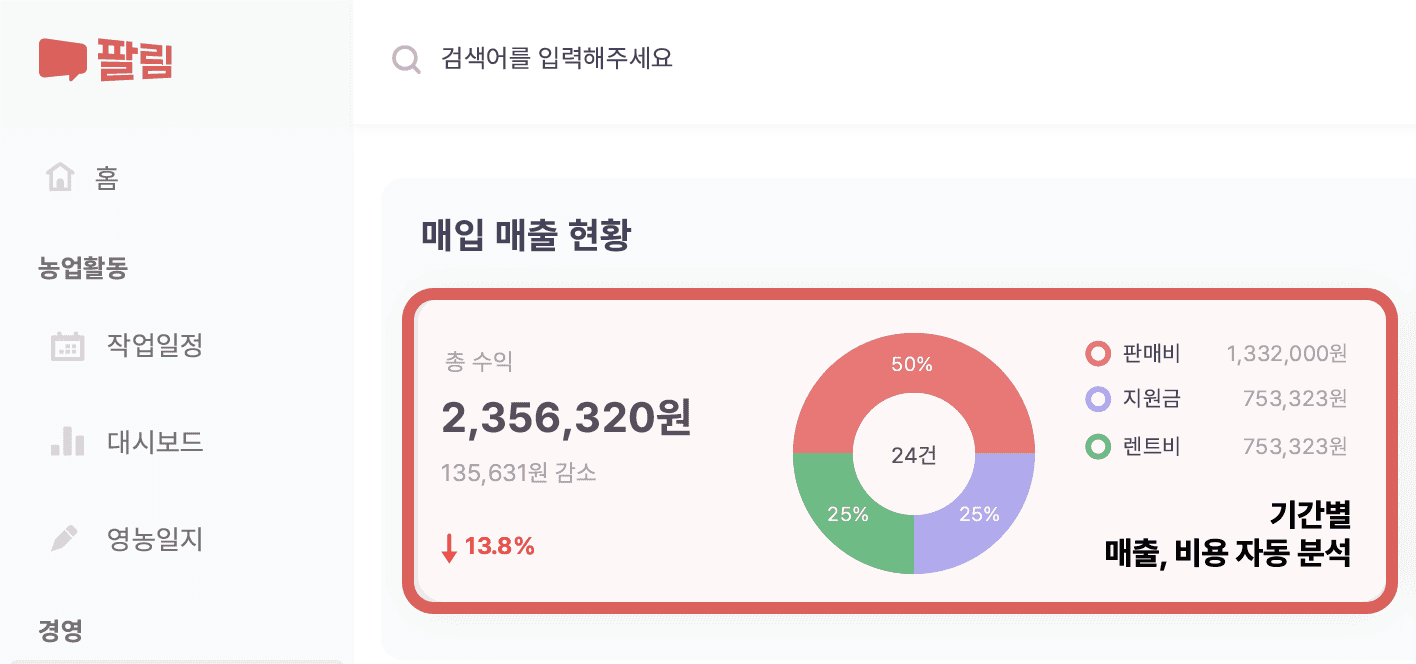 농사 매출과 비용을 자동으로 파악할 수 있는 솔루션이 있습니다. 팔림이 농업 매출과 비용을 한눈에 시각화해드리는데요. 이전 기간 대비 수익이 감소했거나, 매출 대비 비용이 차지하는 비중이 높다면 '비용을 더 절약해봐야겠다'는 객관적인 판단을 내릴 수 있습니다.